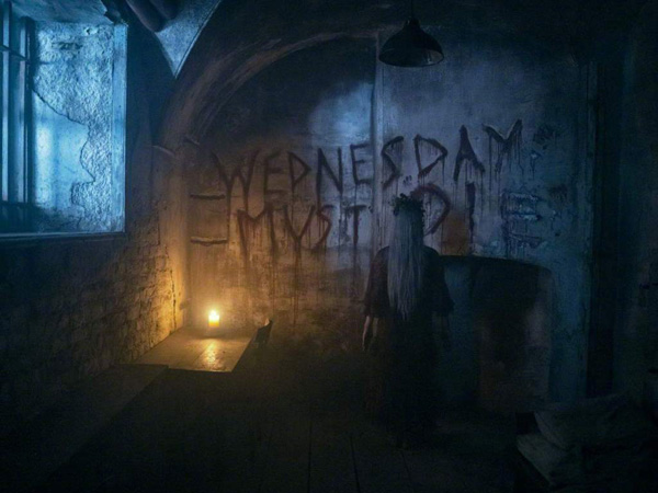 事實上,奧菲莉亞這個人物早在第二季結尾就已悄然登場。在祖母赫斯特家的地窖里,一個身披黑袍、聲音低沉的女性背影首次現身,并與反派勞蕾爾·蓋恩斯產生神秘關聯。當時鏡頭刻意未展示其面容,只是墻上用血寫下了“星期三必須死”的恐怖信息。如今謎底揭曉——這位神秘姨媽,正是由伊娃·格林飾演。