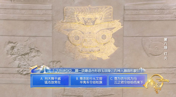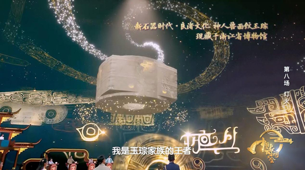 良渚文化是以磨光玉器和黑陶為代表的新石器晚期文化,是中華五千多年文明史的重要實證,在中國和世界文明進程中有著不可替代的重要地位。在良渚的考古發(fā)掘中,出土的琢制玉器,其數(shù)量之多、品種之豐富、雕琢之精美,均達到史前玉器的高峰,其中最具代表性的就是一件被譽為“玉琮王”的文物,它形體寬闊碩大,紋飾獨特,四面都琢刻有完整的神人獸面紋。在本期情景共答環(huán)節(jié)中,節(jié)目用虛擬技術(shù)將這件“玉琮王”呈現(xiàn)在舞臺上,并以“神人獸面紋”為題考查選手。“乘赤豹兮從文貍,辛夷車兮結(jié)桂旗”,神人獸面紋是良渚文化獨一無二的標志,也體現(xiàn)了先民們“天人合一”的觀念和信仰。