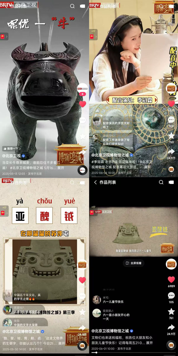 在傳播模式上,節(jié)目還開創(chuàng)了線上線下聯(lián)動的全新格局。一方面,以北京各大博物館的新展為依托,節(jié)目中出現(xiàn)的每一件文物,觀眾都能在線下展廳親眼目睹。這種線上內(nèi)容與線下展覽的緊密結(jié)合。不僅為博物館宣傳引流,更讓觀眾在實地參觀中,對節(jié)目內(nèi)容有了更深層次的理解,實現(xiàn)了從屏幕到現(xiàn)實的文化感知延伸。另一方面,節(jié)目團隊精準(zhǔn)把握短視頻傳播趨勢,推出的牛尊版喊麥視頻、文物界的生僻字等趣味內(nèi)容,在抖音、微博、快手等平臺迅速走紅,單條最高播放量突破 1900 萬次——這些輕松有趣的短視頻,讓原本嚴(yán)肅的文博知識變得鮮活生動,也吸引了大量年輕觀眾的關(guān)注。