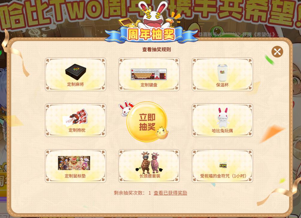 周年慶典抽獎活動已經(jīng)上線,只需每日登錄活動界面即可獲得抽獎機會!精美游戲周邊等你來贏:定制機械鍵盤、《希望OL》主題麻將套裝、哈比兔玩偶、周年慶鼠標墊……轉(zhuǎn)動轉(zhuǎn)盤,讓幸運為你的冒險之旅增添更多驚喜!每日堅持登錄,收獲不一樣的幸運禮物。