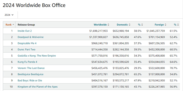 亞洲明星網訊www.ph15800.com 據boxofficemojo數據顯示,截止11月22日,2024年全球票房榜前十影片都是續集,《頭腦特攻隊2》《死侍與金剛狼》《神偷奶爸4》《沙丘2》《哥斯拉大戰金剛2》《功夫熊貓4》《毒液:最后一舞》《怪奇大法師2》《絕地戰警:生死與共》《猩球崛起:新世界》。