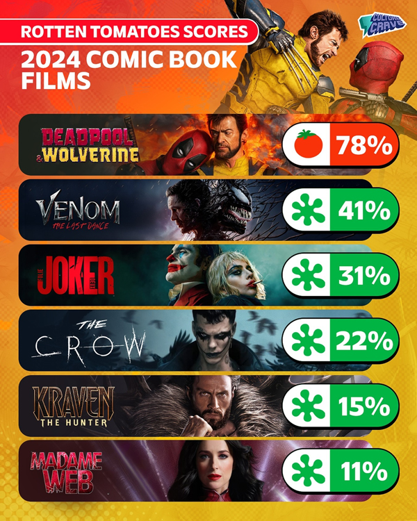 此外,《烏鴉》和《獵人克萊文》的爛番茄新鮮度更是分別低至22%和15%,《蜘蛛夫人》更是只有11%,進一步加劇了漫改電影的困境。這些電影在票房和口碑上的失利,也反映出漫改電影在市場上的不確定性和風險性。觀眾對于漫改電影的期待和要求越來越高,而電影制作方在應對這種變化時,似乎顯得有些力不從心。
