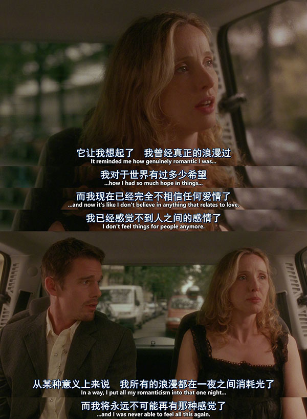 賞析:杰西的這句話充滿哲學意味,挑戰了“幸福在于結果”的普遍認知。他認為,真正的快樂在于追求的過程,而非最終的擁有。這或許也解釋了為什么他和賽琳的短暫相遇如此珍貴——即使他們未能在一起,那段經歷本身就已足夠美好。